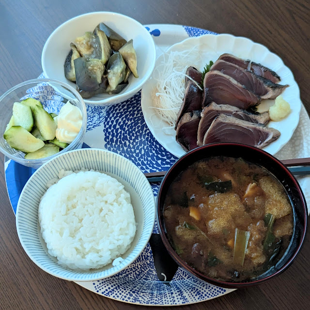 ・ナスの炒め煮・きゅうりの塩もみ+マヨネーズ・白米・味噌汁(小松菜+椎茸+松山揚げ)・かつおのたたき(おろし生姜添え)
